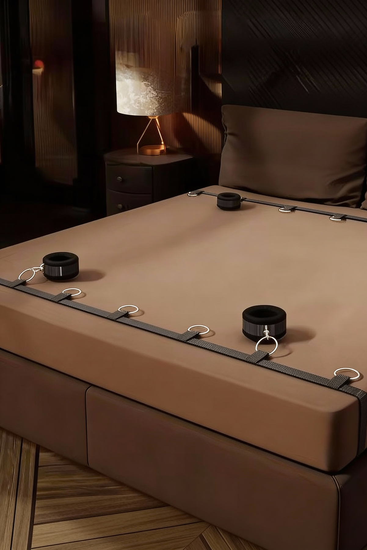 どんな寝室も贅沢で快適、そして抑制された期待感に満ちた空間へと変える、洗練された拘束システムの魅力をご体験ください。穴あけも面倒な作業も、恒久的な設置も不要。手軽に、そして多用途にお使いいただけます。